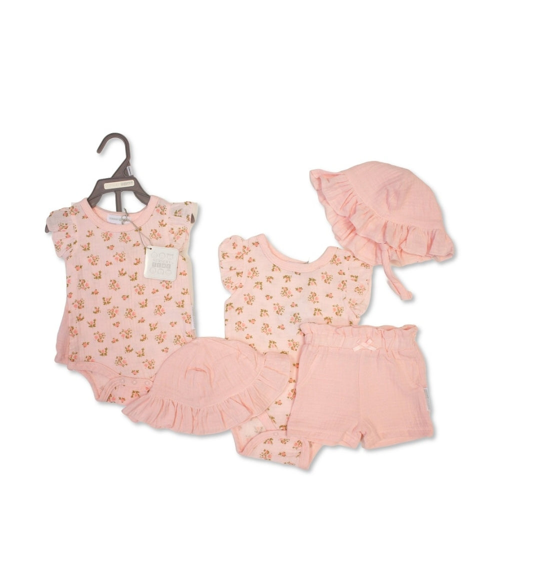 Indulge your little princess in the ultimate comfort and cuteness with our Baby Girls Pink Floral Print 3 Piece Set. The charming pink ditsy print vest and matching paper bag style shorts with elasticated waist and bow detail will have your baby looking and feeling like a true fashion icon. The frills and sun hat with strap add an extra touch of elegance, making it perfect for baby's first holiday. Made with soft and cosy material, your baby will be comfortable and stylish all day long.