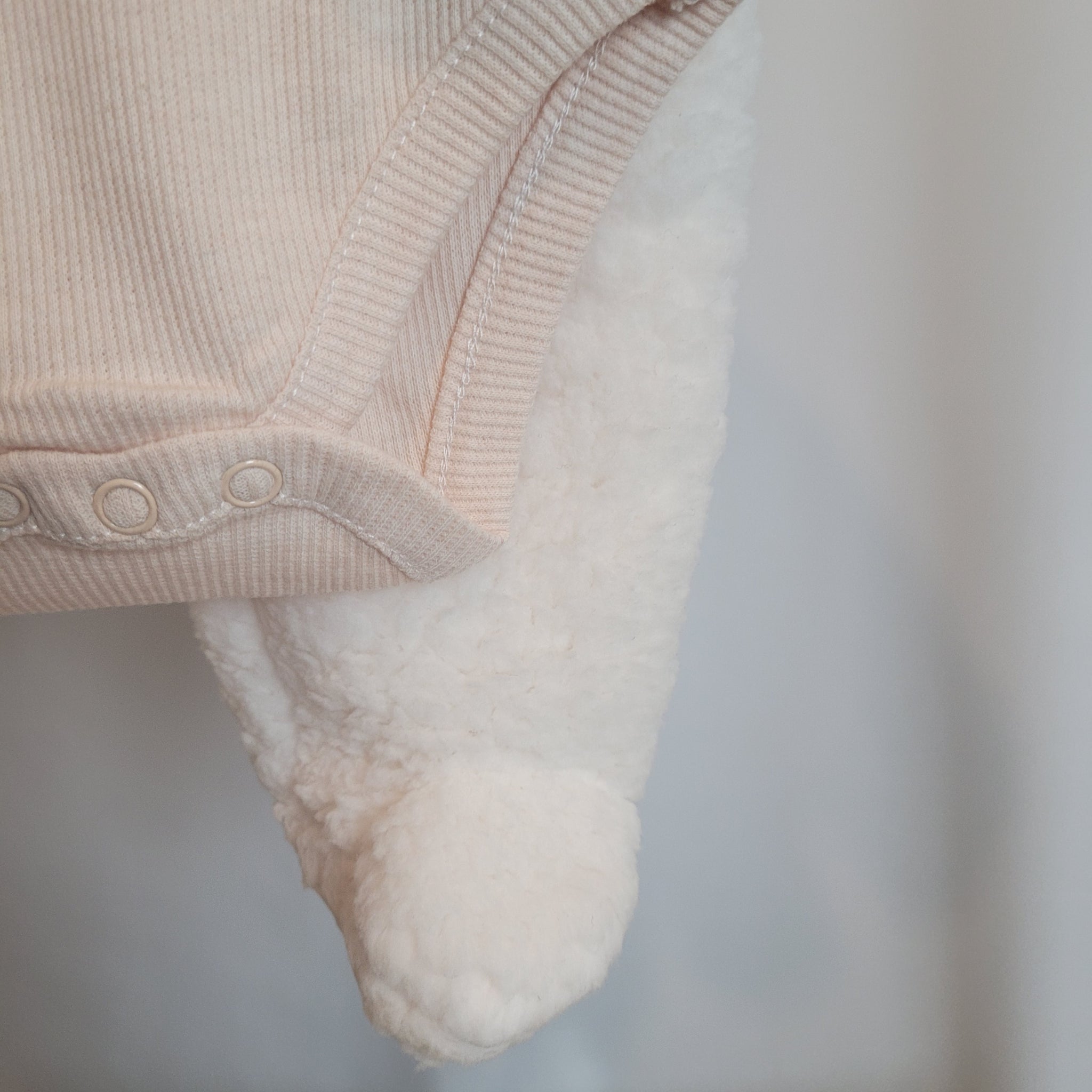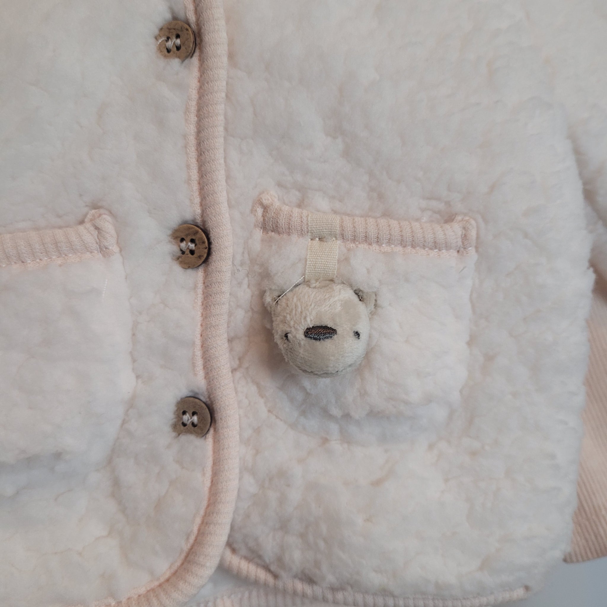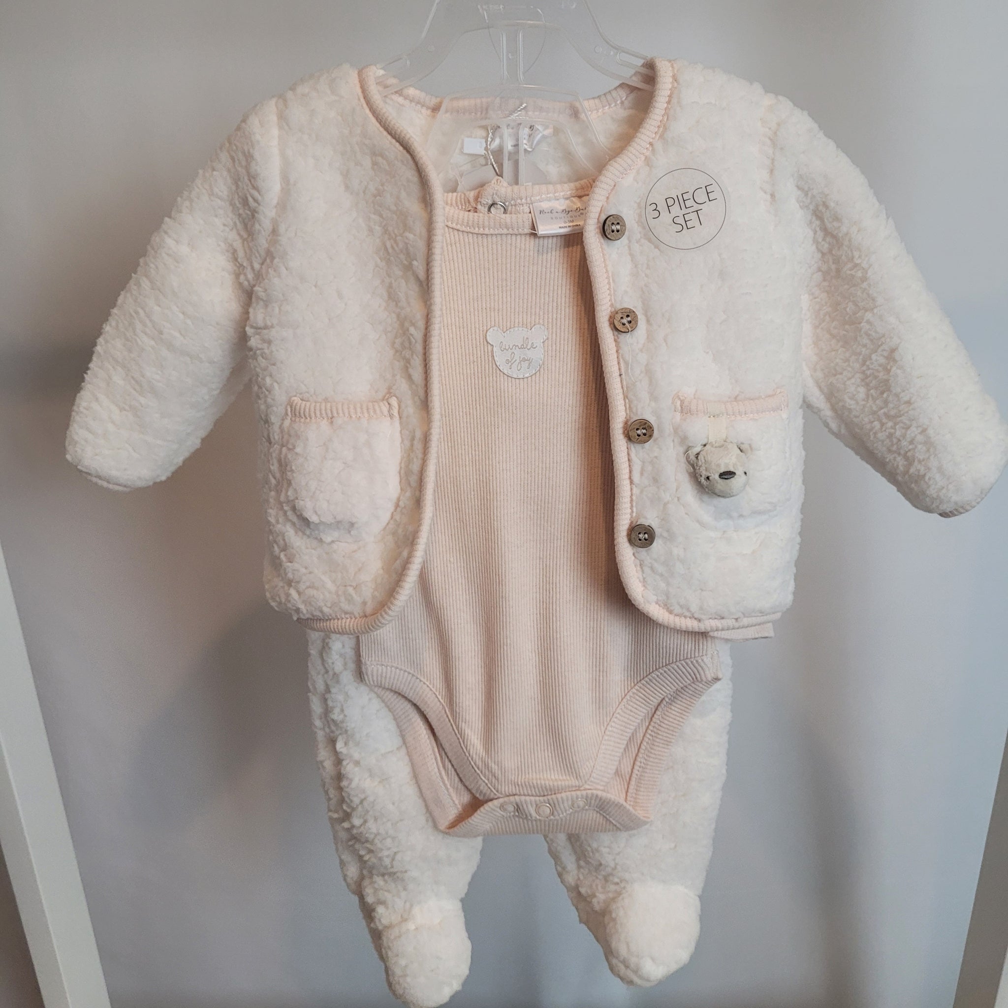 Expertly crafted for new babies, this 3 piece cream Borg fleece outfit is a must-have for colder months. The cream Borg fleece jacket features, beige piping, wooden buttons and 3D bear design on the pocket, while the matching bottoms have feet for added warmth. The beige ribbed bodysuit adds extra snuggly comfort. The perfect new baby gift for a newborn, a Christmas gift for the colder months ahead or just because for your own little one!