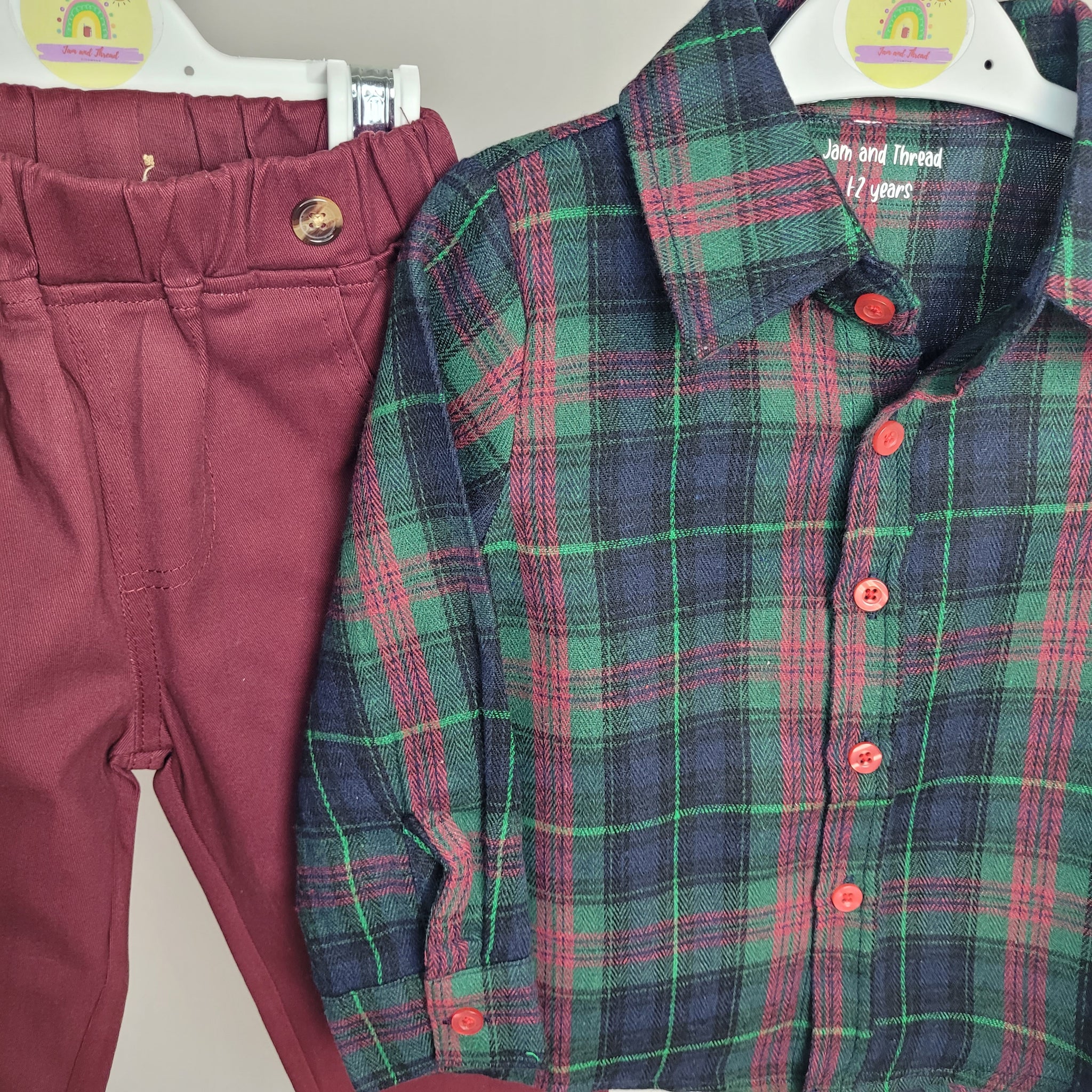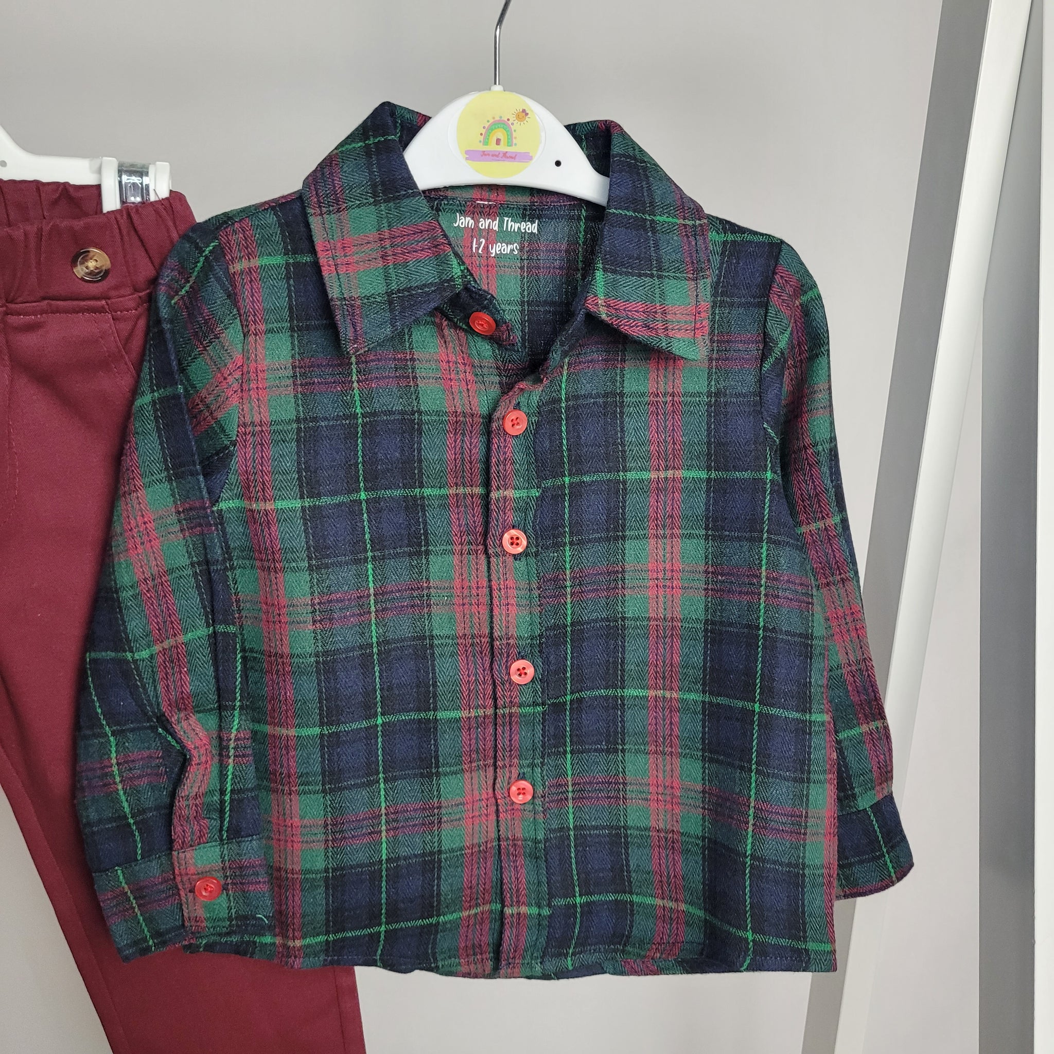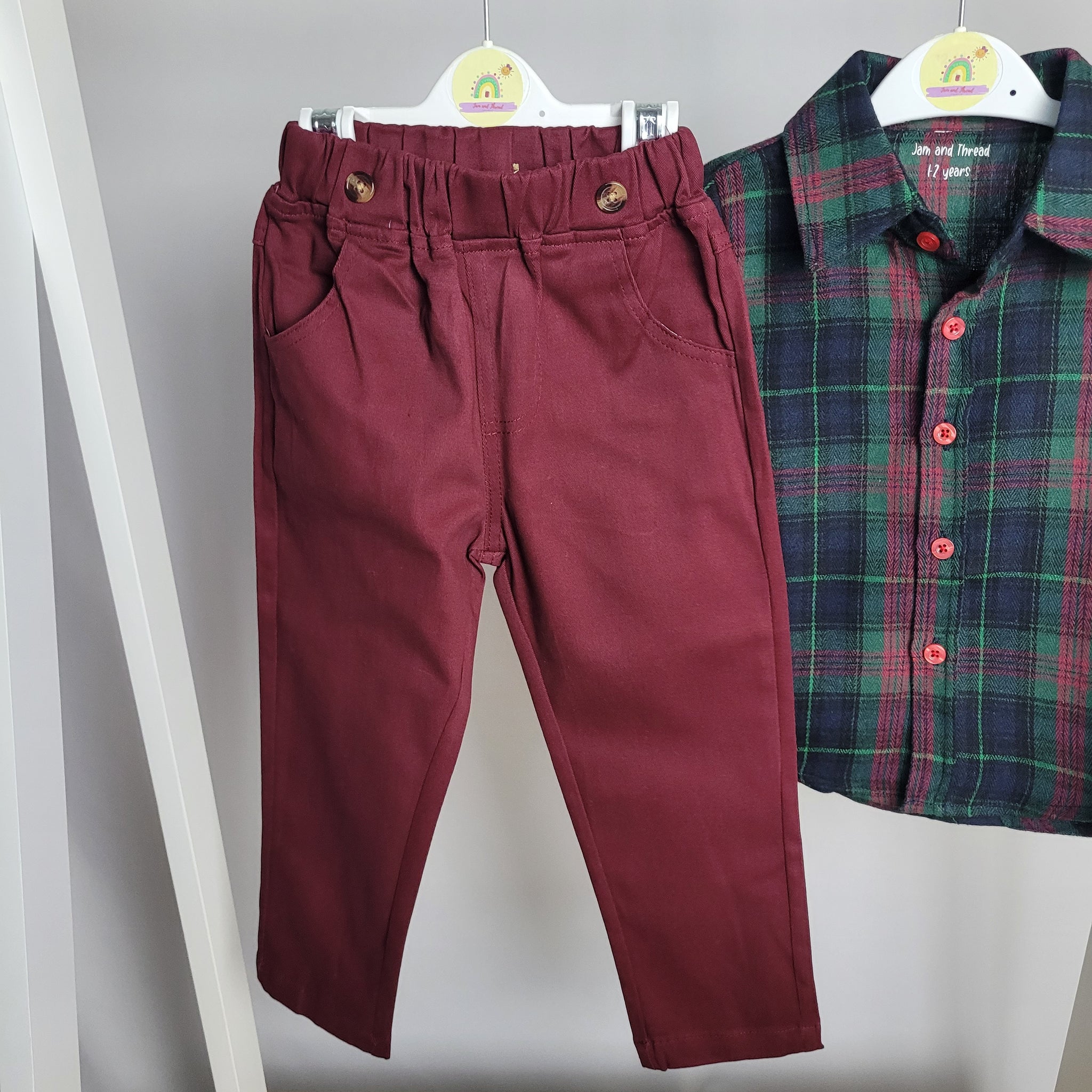 This festive outfit features a soft flannel plaid shirt with shades of green and maroon, perfect for your little boy's Christmas festivities. The maroon trousers have an elasticated waist and button detailing, allowing for a comfortable fit. Wear with cuffs rolled up or down for a versatile look.