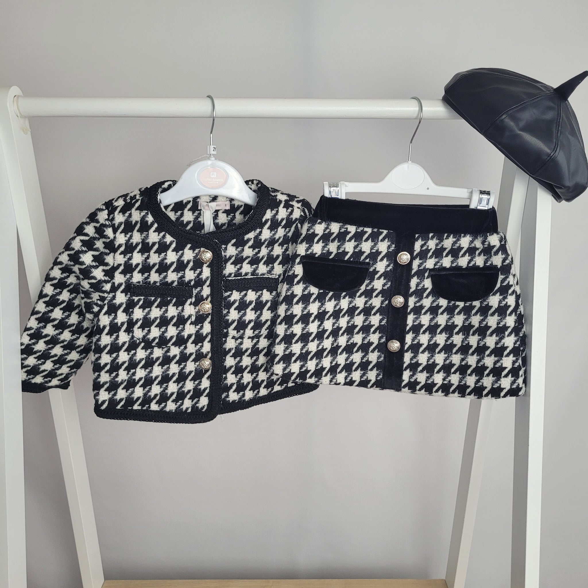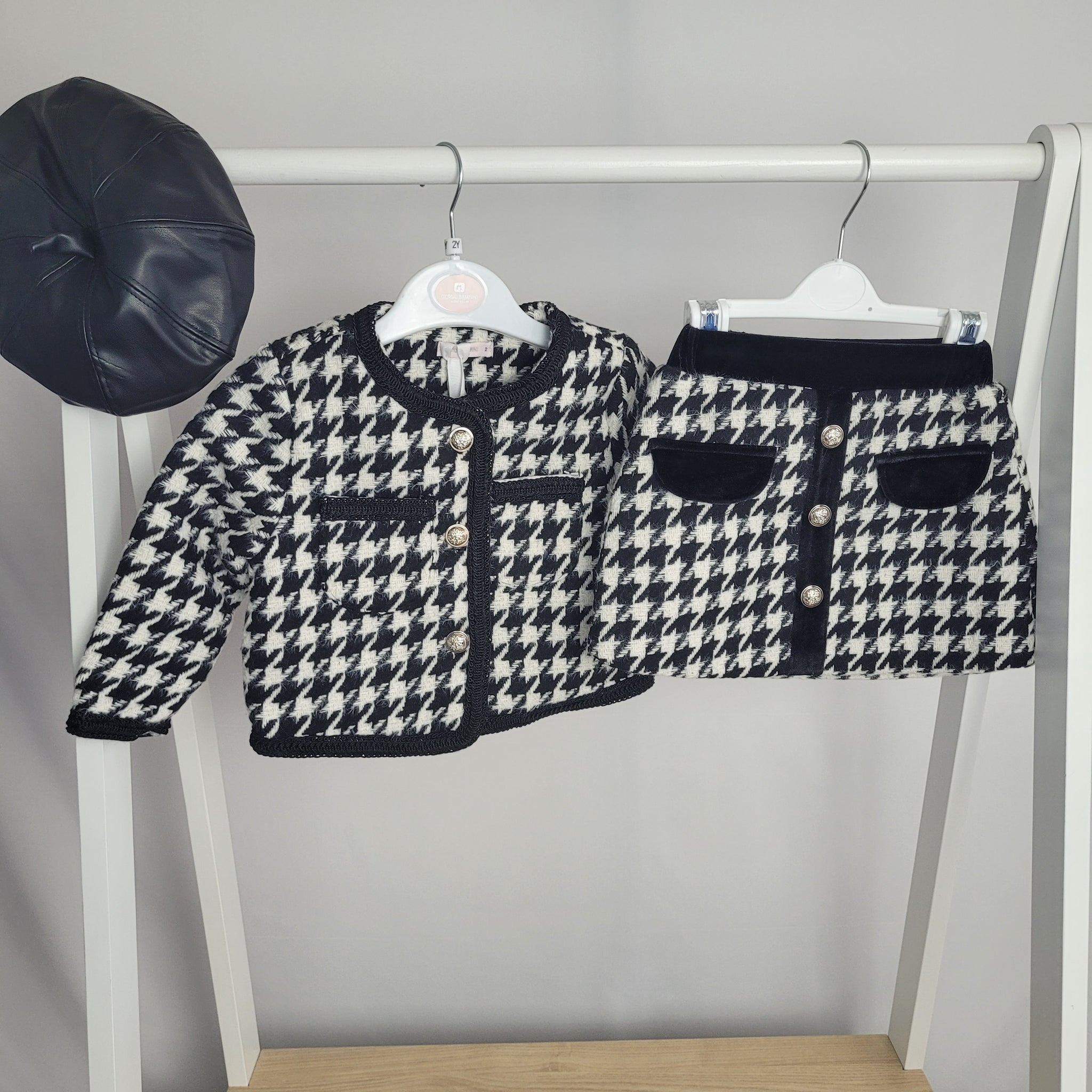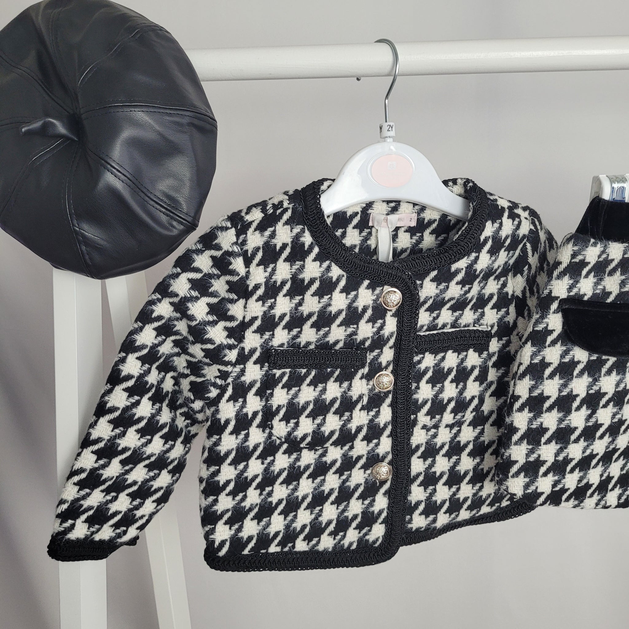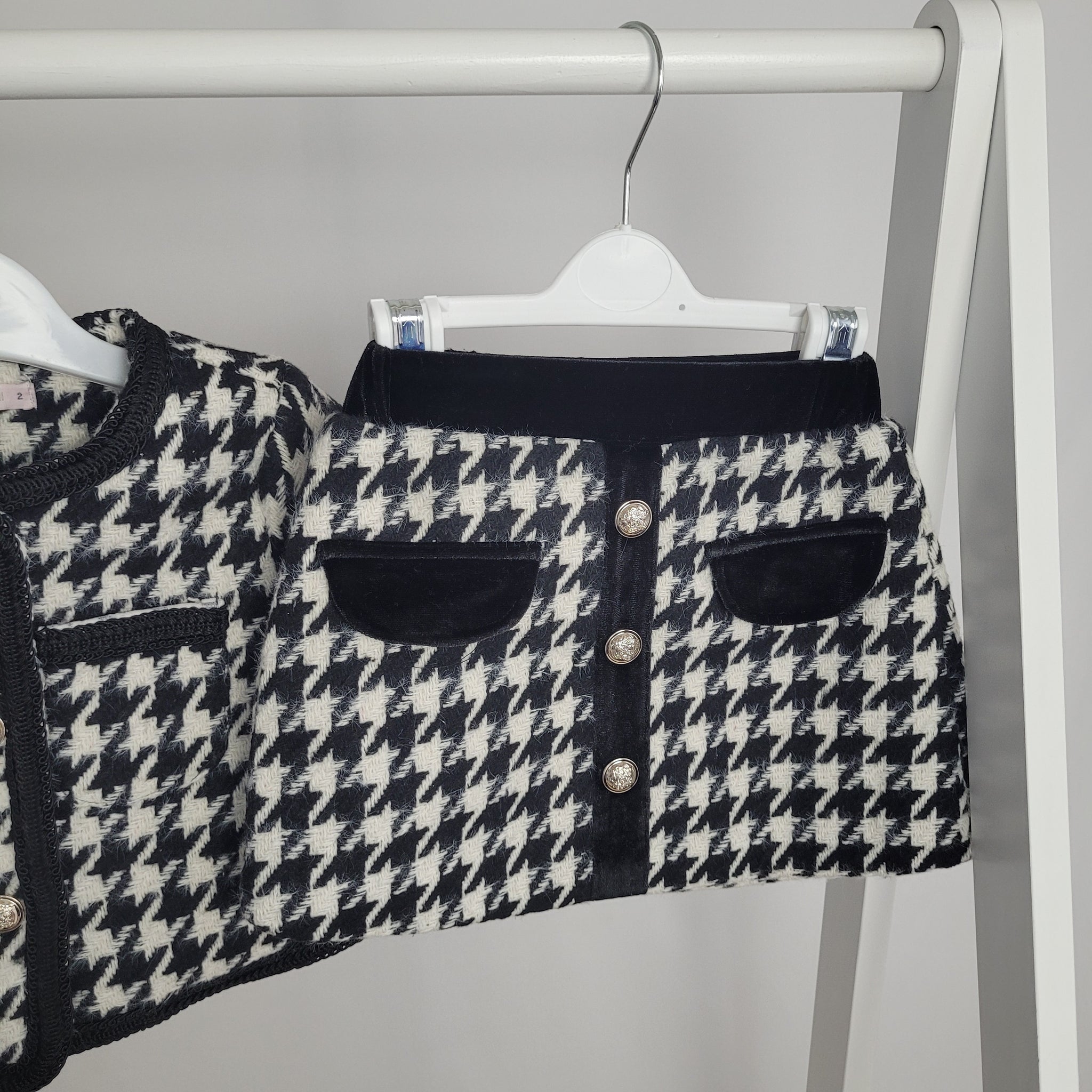 Elevate your little girl's style with our Girls Two Piece Dogtooth Embossed Jacket & Skirt Set with Hat. This luxurious 3 piece outfit features a dogtooth skirt and jacket adorned with velvet trim and embossed metal buttons, paired with a trendy faux leather beret. Perfect for parties and special occasions, this set exudes a high-end aesthetic without the hefty price tag.