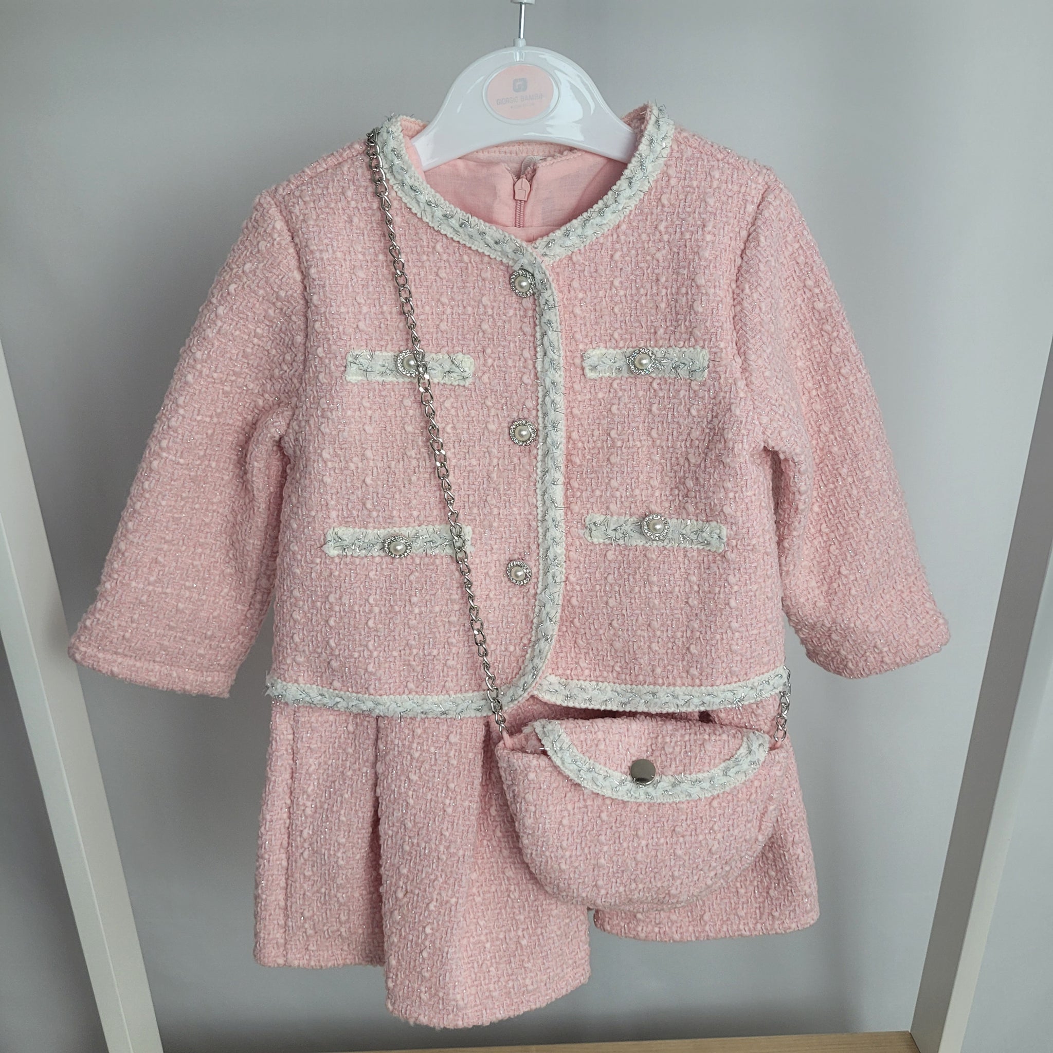 Add a touch of luxury and elegance to your little girl's wardrobe with the Girls Two Piece Glitter Embossed Dress & Jacket Set with Purse-Pink from Gio Bambini. Made with thick luxurious material, this 3-piece set features a stunning pink and silver tweed dress and jacket, completed with a matching purse. The decorative details, such as pearl buttons, add a touch of sophistication to this gorgeous outfit, perfect for any festive occasion. Crafted from 80% polyester and 20% wool, this set is not only stunning but also durable and comfortable for your little one.