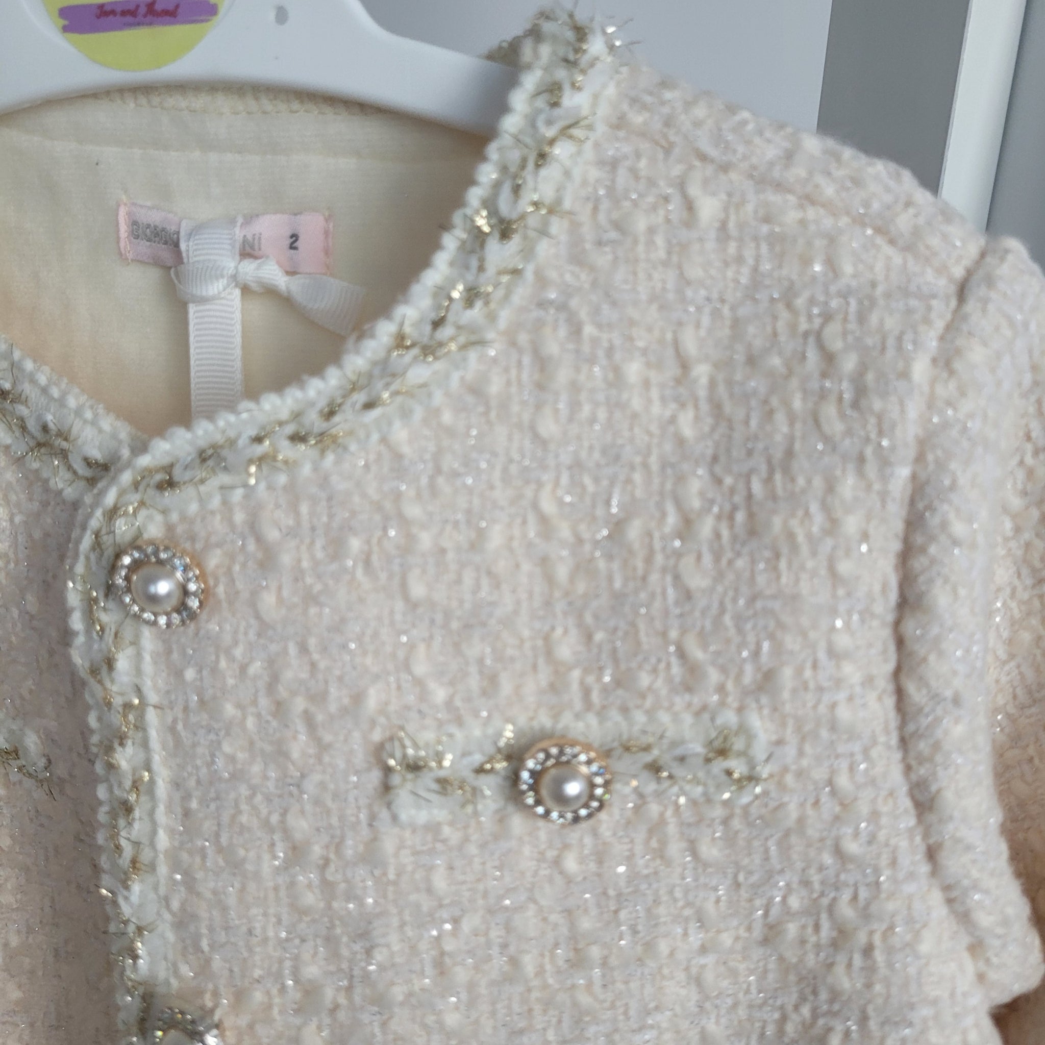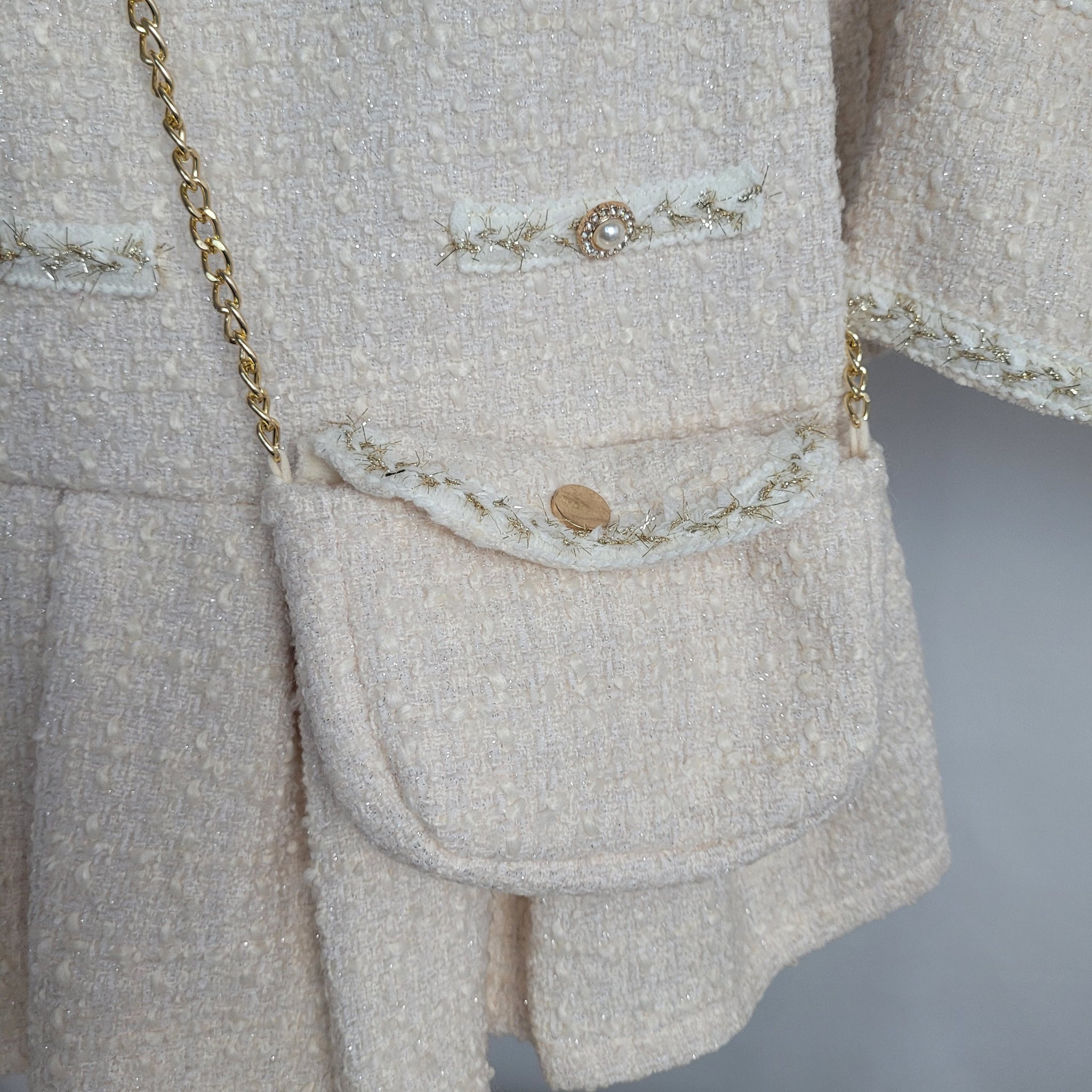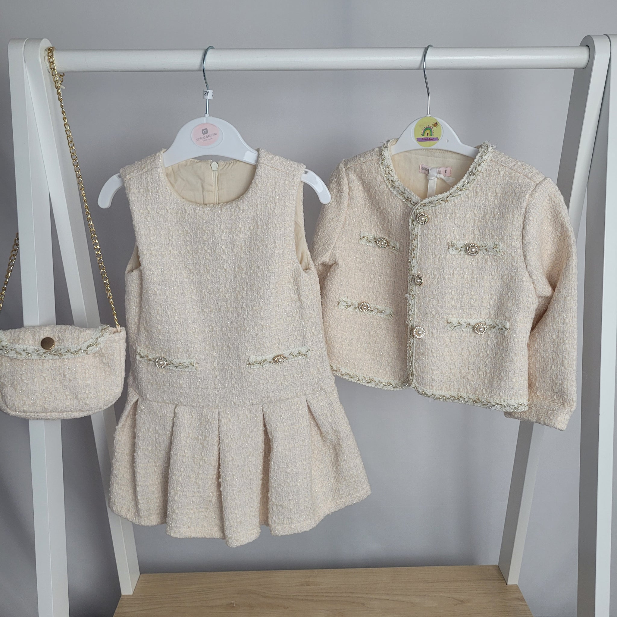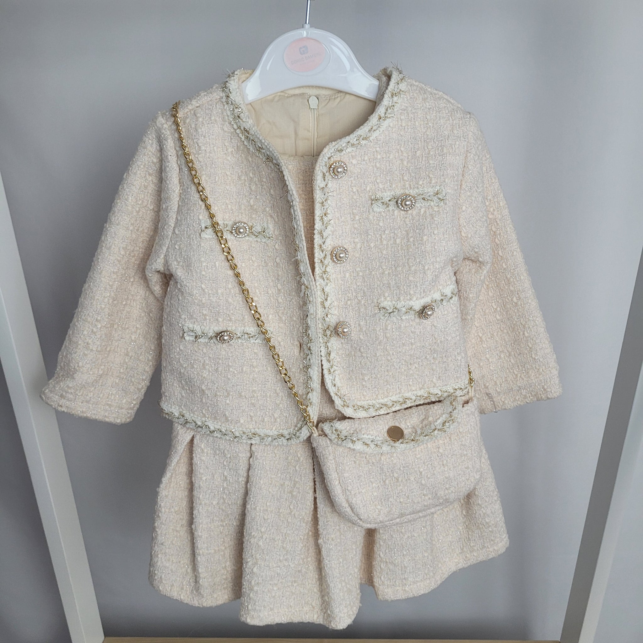 Add a touch of class to your little girl's winter wardrobe with this luxurious two piece set from Gio Bambini. The tweed dress features a pleated skirt and is paired with a matching jacket and bag in cream and gold. With a sparkling glitter embossed design and stunning pearl buttons, she'll step out in style this festive season. Made. From 80% Polyester and 20% wool. Wash at 30 degrees